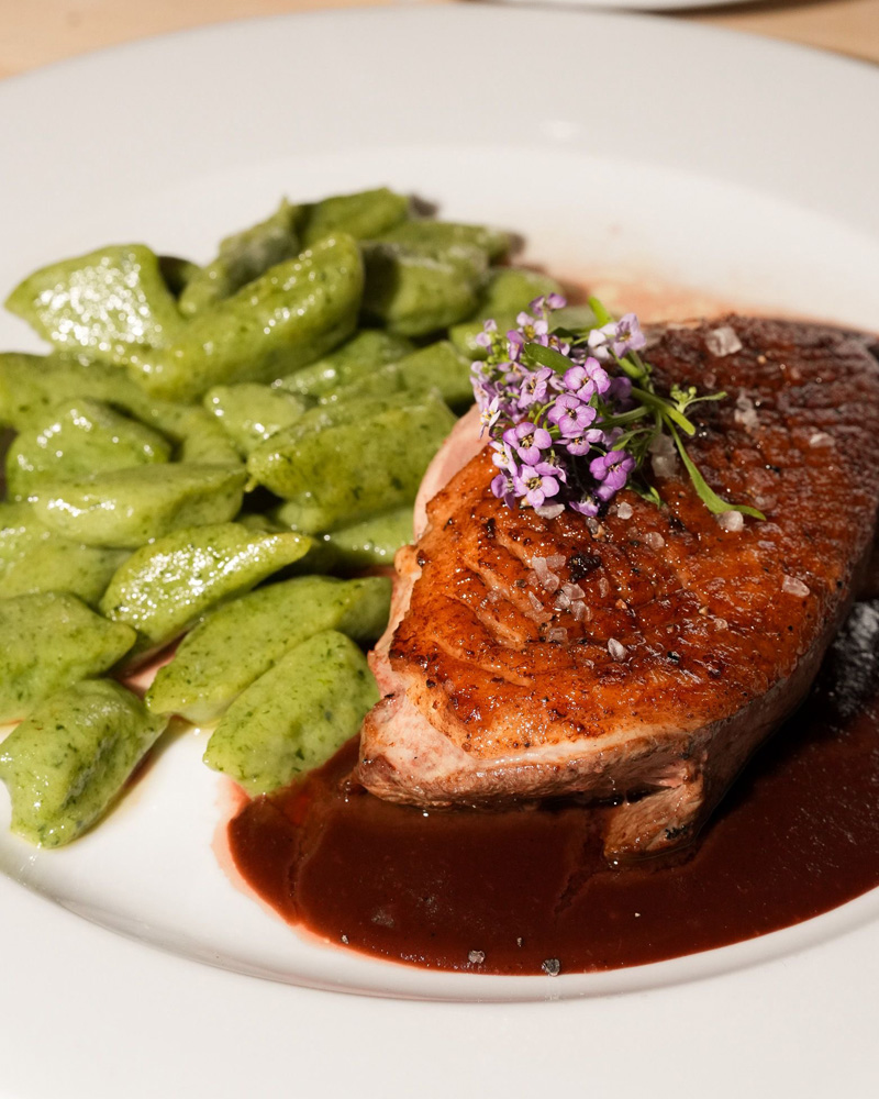 - Pierś z kaczki z sosem czekoladowo-śliwkowym podawana z kopytkami szpinakowymi i surówką z białej rzepy